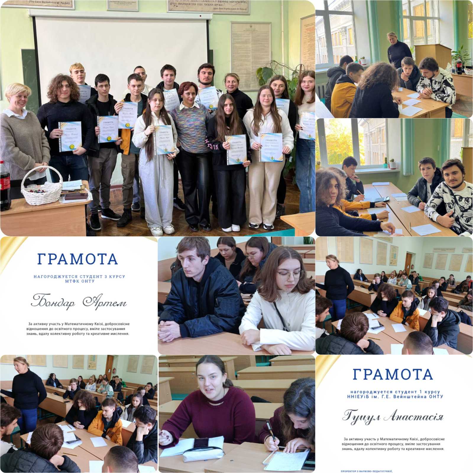 Ярослав, Вірич Максим, Демержі Сергій, Малюта Вадим (керівник к.ф.-м.н., викладач вищої категорії, викладач-методист МТФК ОНТУ Комкова О.А.). Незважаючи на результат, перемогу святкують обидві команди, бо це було справжнє математичне свято.